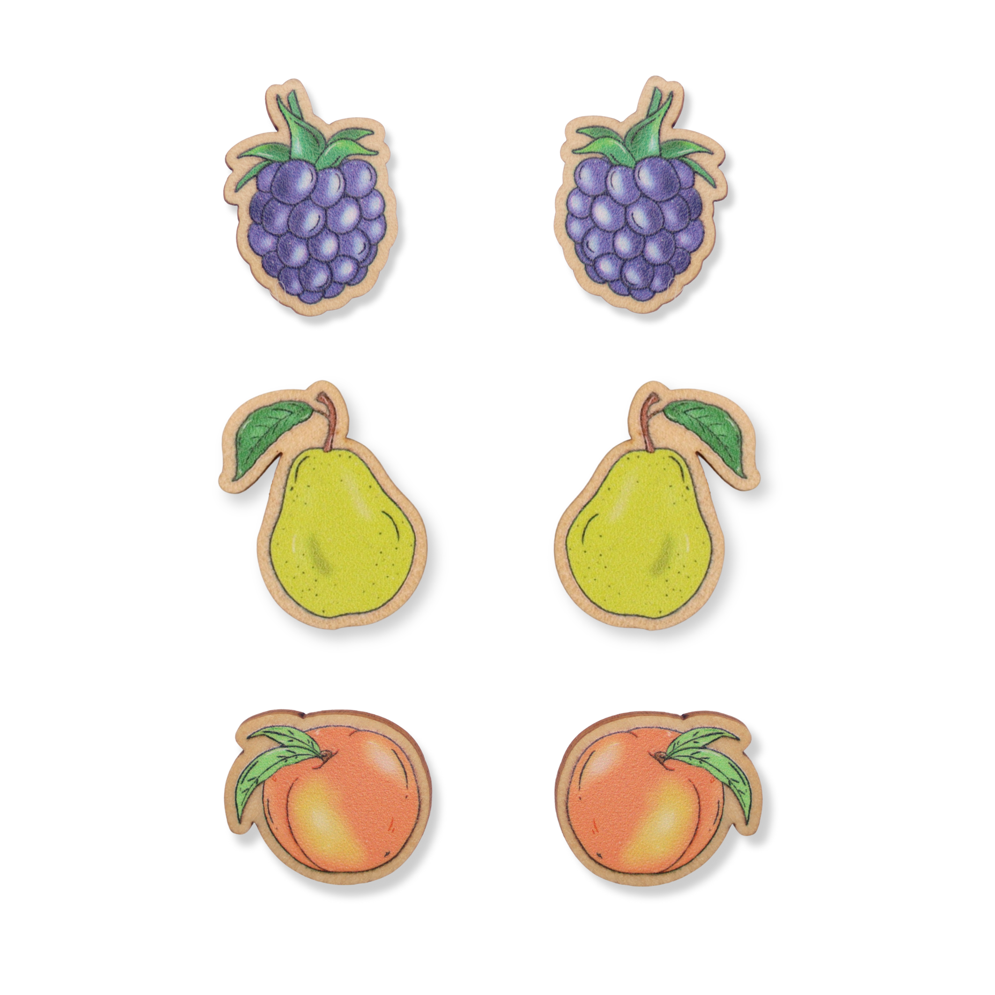 Have a fruitin' tootin' good time with these cute blackberry, pear & peach studs.