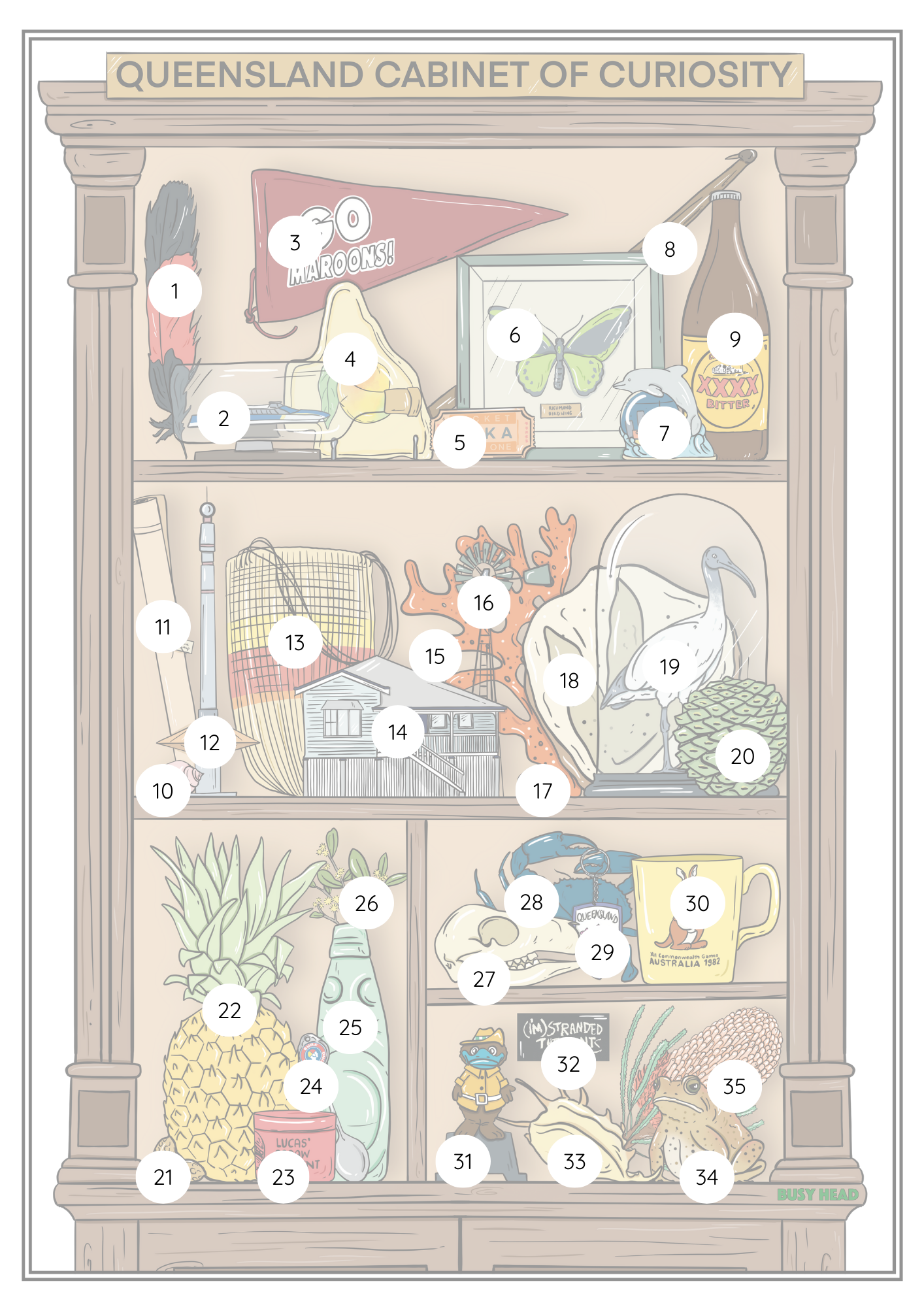 Illustrated by Busy Head in Bardon, Brisbane these postcards are printed on natural, uncoated card in Australia. Inspired by eighteenth century cabinets of curiosity, this design celebrates some Queensland icons including the Coral, Queenslander houses, The Saints and Expo 88.